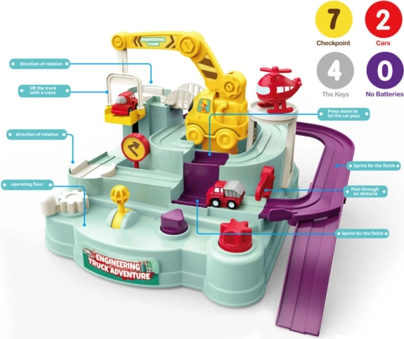 Denne forhindringsbane forvandler hver køretur til et lille eventyr. På ruten venter en række forhindringer, som børnene klarer takket være smart styring med hjul og håndtag. Hver succes motiverer til nye forsøg og bringer masser af glæde og sund konkurrence.