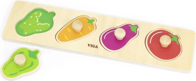 Dette kvalitets træpuslespil med grøntsagsformer (peberfrugt, gulerod, aubergine, tomat) er et ideelt første puslespil for børn fra 1 år. Store brikker med grebsknapper understøtter korrekt greb, træner hånd-øje-koordination og hjælper børn med at skelne farver og former.