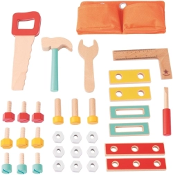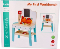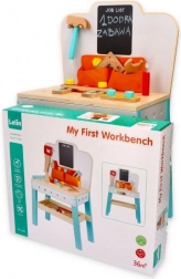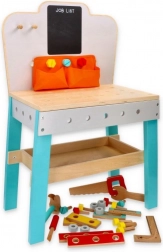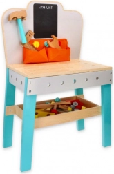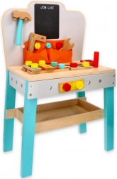 Børnearbejdsbordet i træ med tavle er en ideel gave til små gør-det-selv-folk. Bordet indeholder passende tilpassede træværktøjer som hammer, sav og nøgle, der gør det muligt for børn at simulere forskellige konstruktions- og reparationsaktiviteter. Med tavlen JOB LIST kan børn planlægge deres projekter og lære arbejdsorganisering. Praktiske værktøjslommer og hylder giver rigelig opbevaringsplads.