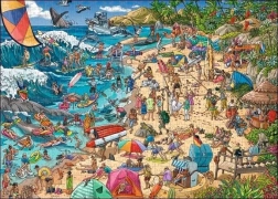 Det færdige puslespil har dimensioner på cirka 70 x 50 cm og er ideelt til hyggelige familietimer eller afslapning alene. Dyk ned i den levende strandatmosfære, hvor folk nyder surfing, svømning og afslapning på en solrig dag.