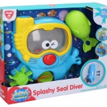 Akvarium med vandmølle gør dit barns badetid til en spændende oplevelse. Brug skeen til at fylde vand i sælens briller og se fiskene danse rundt i akvariet. Tryk på sælens næse og nyd et vandsjov med farverige møller.