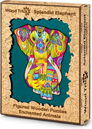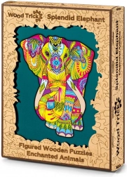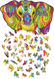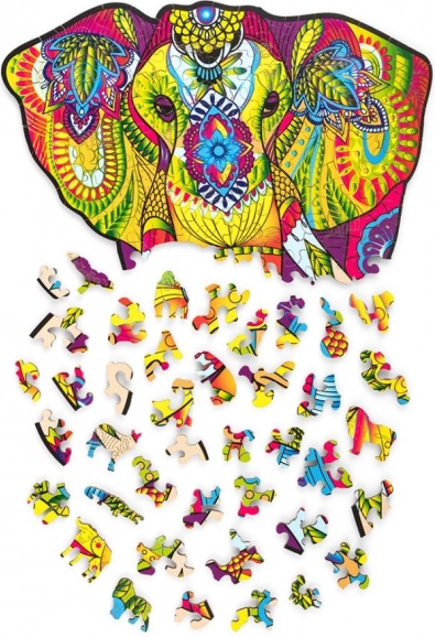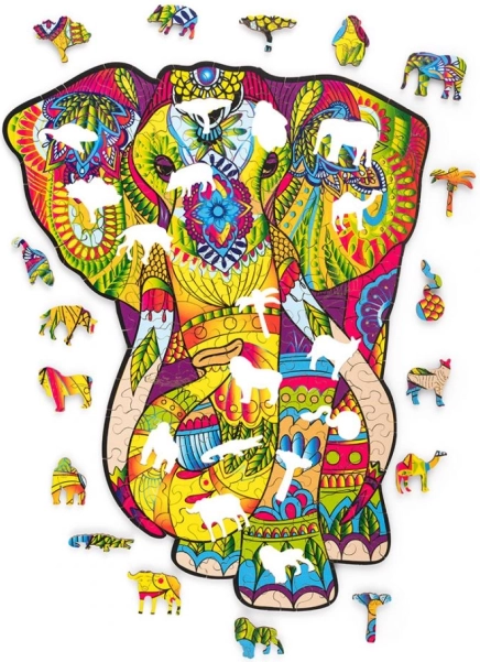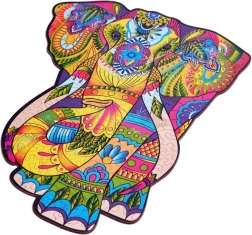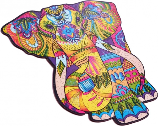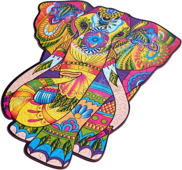 Dette detaljerede elefantpuslespil i kvalitets træ imponerer med udsøgte mønstre og mættede farver. Ideelt til unge og voksne, der søger stilfuld underholdning og et designet interiørelement.