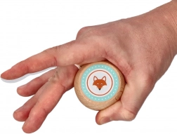 Kvalitetskroppen i træ med glade motiver (ræv, hjerte, svamp m.fl.) ligger godt i hånden og indbyder til leg.