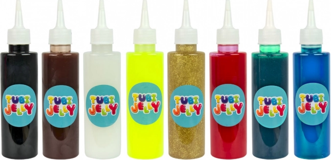 - 8 geléfarver (150 ml) – blå, hvid, rød, neon, brun, turkis, sort og glitter