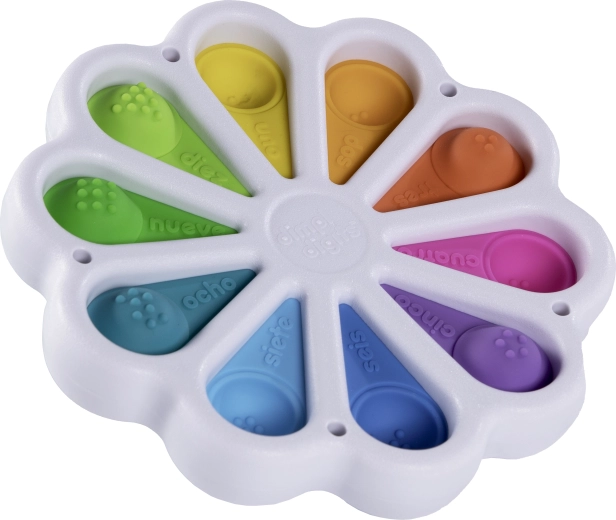 Oplev det sjove sanselige legetøj Dimpl Digits fra FAT BRAIN – blomsterformede pop-bobler med tal og tælling, der støtter fin- og grovmotorik, øje–hånd-koordination og sund psykomotorisk udvikling. De farverige silikonebobler indbyder til at blive trykket på, lære farver og de første tal. Velegnet fra fødslen.