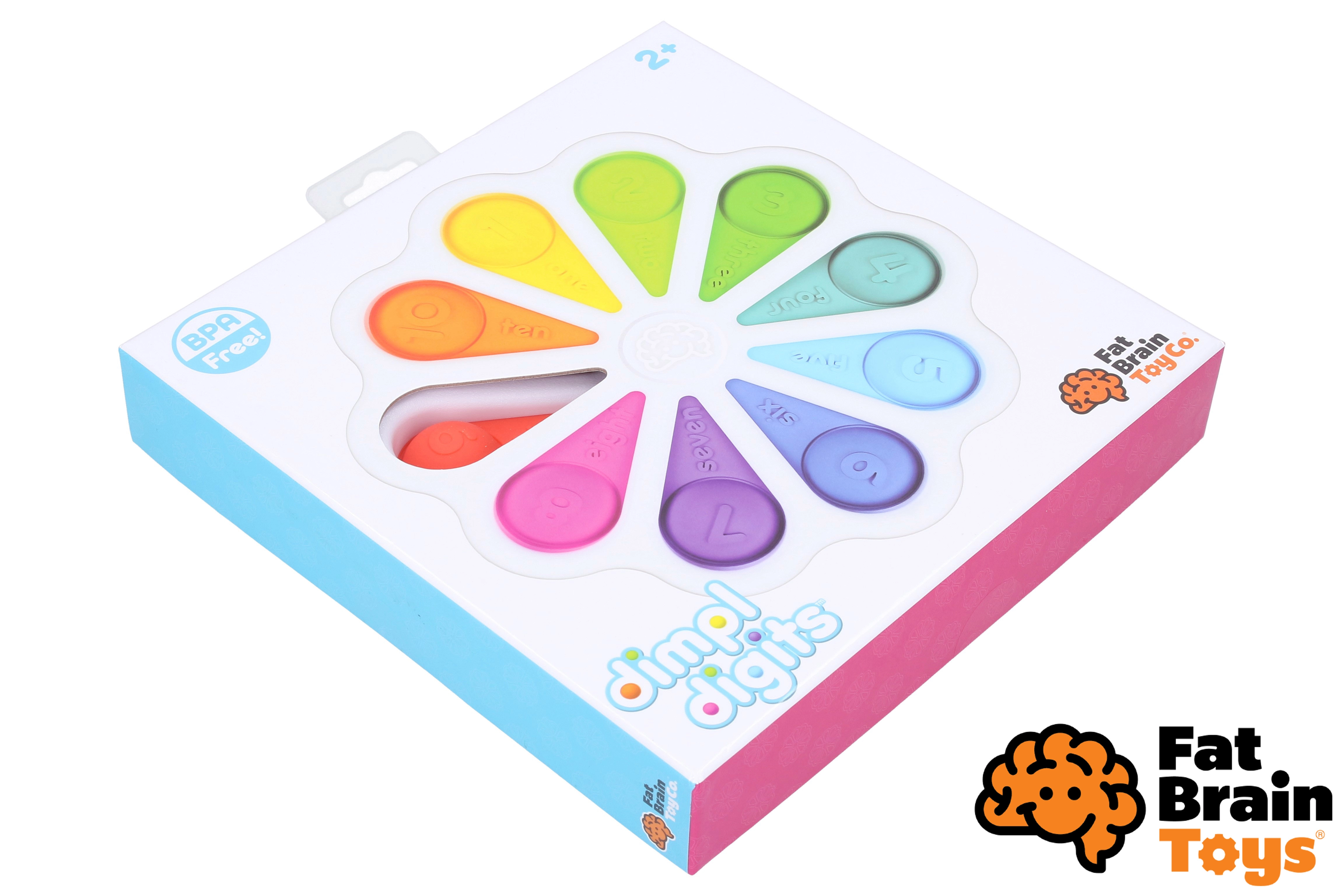 Det sanselige legetøj Dimpl Digits giver børn en beroligende pop-effekt og de første skridt mod at lære tal at kende. På toppen af hver boble er tallet med det engelske ord, og på undersiden et antal prikker svarende til tallet – så forbinder børnene naturligt syn, berøring og grundlæggende matematiske færdigheder.