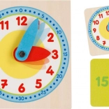 Et sjovt og praktisk læresæt, hvor børn nemt lærer at kende timer, minutter og skelne mellem formiddag/eftermiddag samt analog og digital tid. Uret med bevægelige visere på æskens låg og 12 dobbeltsidede træbrikker støtter legende læring og udvikling af logik. Fremstillet af kvalitetstræ med ufarlige farver.