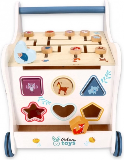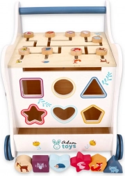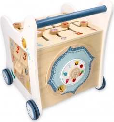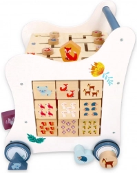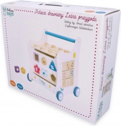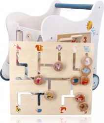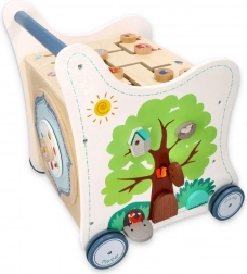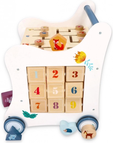 Denne trægåvogn fører dit barn ind i en verden af farver, former og skovdyr. Frontpanelet byder på en sjov puttekasse, der udvikler finmotorik, hånd-øje-koordination og logisk tænkning. På toppen venter en labyrint med skydelige perler, som styrker tålmodighed, planlægning og rumlig forståelse. Sideillustrationer med dyr inspirerer til at udforske naturen og finde på egne historier.