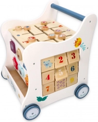 Gåvognen vokser med barnet – fra de første skridt og træning af balancen til legende tal-læring takket være de drejelige elementer med 1–9. Skridsikre hjul sikrer jævn og stabil kørsel uden at beskadige gulvet, konstruktionen er solid, og kanterne er glat slebet. Toppladen er aftagelig, så den kan bruges som hemmeligt skattekammer eller som vogn til yndlingslegetøjet. Nemt at vedligeholde – tør blot af med en fugtig klud; enkel montering med medfølgende vejledning.