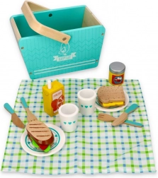 Dette mintfarvede picnicsæt vil glæde enhver lille vært. I den robuste trækurv finder du tallerkener, bestik og et farverigt udvalg af træmadvarer – bagværk, ost, frugt og drikke – samt en ternet serviet til stilfuld borddækning. Sættet er ideelt til rolleleg og læring gennem leg.