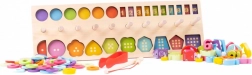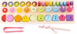 Denne multifunktionelle trælegetøj er ideel til de første skridt ind i verden af tal og former. Børn øver gennem leg farvegenkendelse, tilknytning af tal 1–10, trækning af ringe og at fange brikker med en magnetisk fiskestang. Sættet indeholder også plastikpincetter for øget sværhedsgrad og træning af greb.