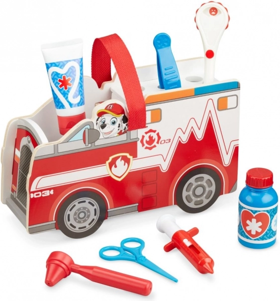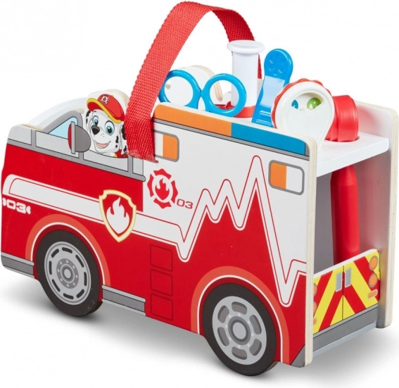 Understøtter rolleleg, finmotorik og sociale færdigheder. Børn kan prøve redderes og lægers arbejde med tilbehør som sprøjte, saks, flaske og badge. Det praktiske håndtag gør det nemt at tage legen med overalt.