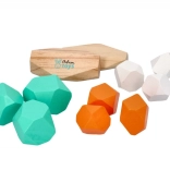 Farverige geometriske former, inklusiv turkis, orange og hvide polyedriske figurer, sammen med en base af naturligt træ, tilbyder en stilfuld æstetik.