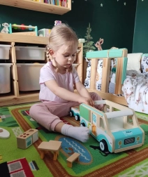 Den aftagelige trailer og det rummelige interiør i campingvognen gør det muligt at tilføje mere legetøj og understøtter dynamisk og varieret leg.