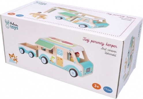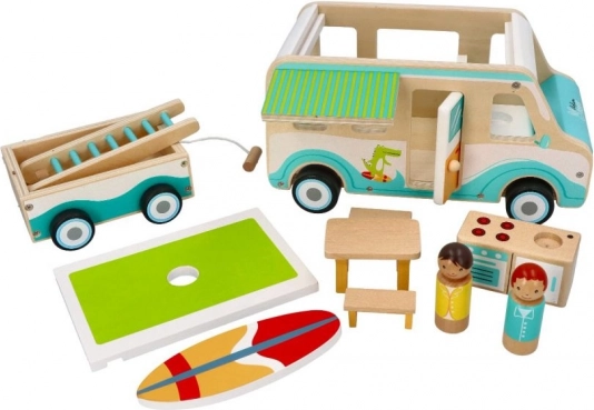 Træcampingvogn med trailer og tilbehør til kreativ og sjov leg for børn. Ideel til børn fra 3 år.