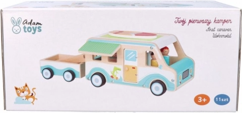 Nyd sjov leg med en træcampingvogn, der bringer stemningen af ægte rejser. Takket være det rummelige interiør og traileren kan du tage flere legetøj og tilbehør med på turen. Dette træ sæt udvikler kreativitet og støtter fantasifuld leg.