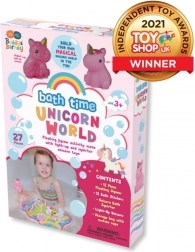 Badesættet Enhjørningeland bringer børn ind i en farverig verden fuld af enhjørninger, slotte og magiske stier. De lette skumdele flyder, samles som puslespil og hæfter på glatte overflader i badeværelset, når de fugtes. Børn kan fortælle deres egne historier og udvikle fantasien direkte i badekarret.