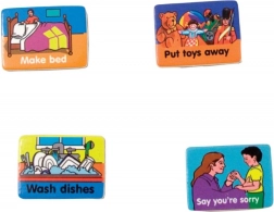 Fire forskellige kort illustrerer huslige opgaver som at rede sengen eller vaske op og hjælper børn med at huske deres pligter.