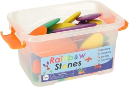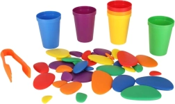 Farvede sten, kopper og opgavekort guider børn fra simple til mere avancerede aktiviteter: fra sortering efter farver til addition og mønsterskabelse.