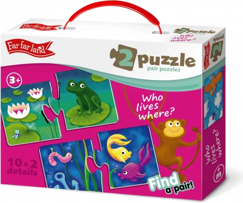 Far Far Land Puzzle er den ideelle læringslegetøj til børn fra tre år. Dette sæt indeholder 10 puslespilsbilleder, hver bestående af to brikker - på den ene er der et dyr og på den anden dets bolig. Med dette spil lærer børnene at genkende forskellige typer dyr og deres miljøer, hvilket udvikler deres evne til sortering og kombination.