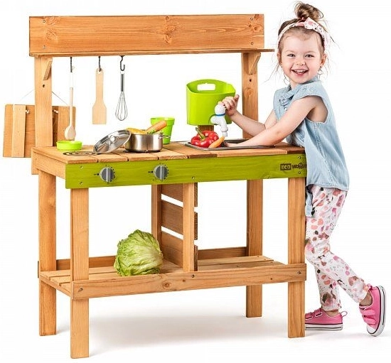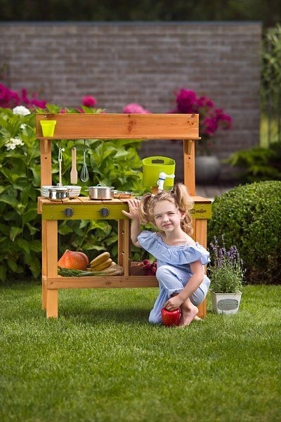 Takket være de markante grønne detaljer passer køkkenet flot ind i haven og understøtter sanseleg med vand, jord og blade. Det er ideelt til børn fra 3 år og hjælper med at udvikle fantasi, rolleleg og sociale færdigheder.