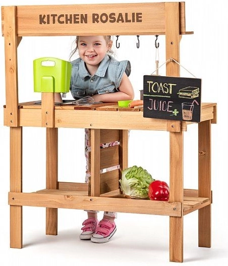 Trækøkkenet Rosalie giver børn et realistisk rum til rolleleg som kok – fra at røre og vaske i plastvasken til at servere på arbejdsbordet. Den robuste kombination af træ og plast egner sig til udendørs brug, mens kroge og hylder holder alt grej og “ingredienser” overskueligt lige ved hånden.