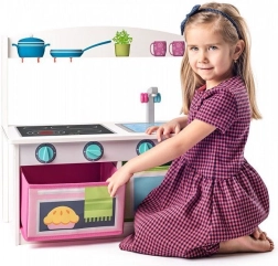 Dette multifunktionelle trælegekøkken og bænk 2-i-1 giver børn timevis af sjov og praktisk anvendelse i ét. Køkkenet er udstyret med en kogeplade med drejeknapper, en vask med vandhane og opbevaringsrum, der minder om ovn og mikrobølgeovn. Takket være den stabile konstruktion er det velegnet til daglig leg og siddning.