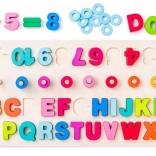 Tavlen kombinerer læring af alfabet, tal og grundlæggende matematiske operationer, hvilket gør den til et alsidigt værktøj for børn.