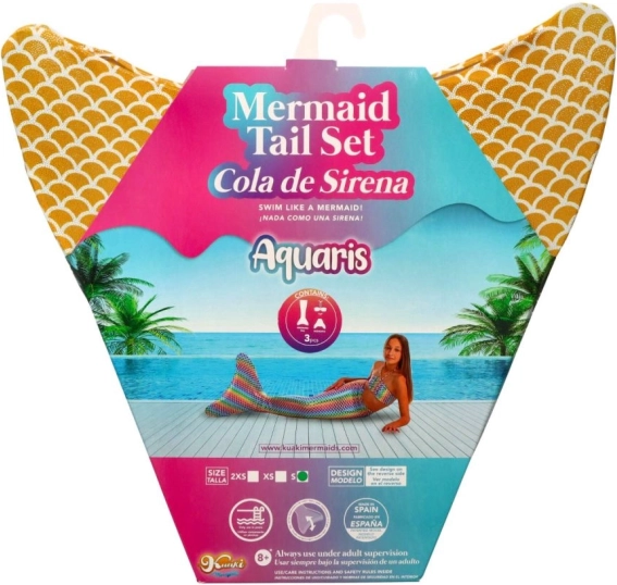 Med sættet finne og bikinier Aquaris Sunny får dit barn en sand undervandsoplevelse! Denne kostume-løsning er designet med fokus på børns sikkerhed og komfort, men anbefales kun brugt under opsyn af en voksen. Fås i tre størrelser: 2XS, XS og S, så hvert barn kan finde sin rette størrelse.