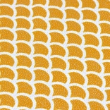 Det anvendte materiale er designet til at modstå almindeligt slid og riv. Mønsteret med orange halvcirkler og hvide prikker på hvid baggrund giver finnen et elegant visuelt udtryk.