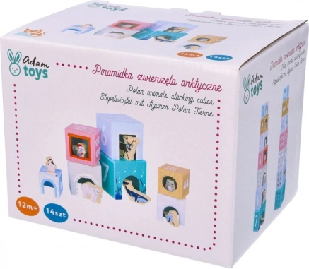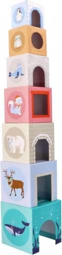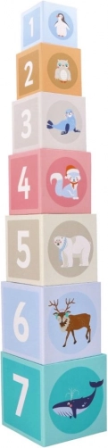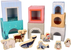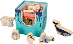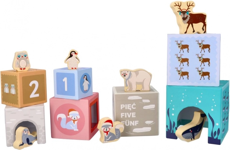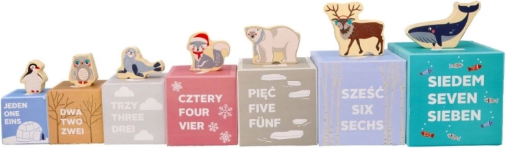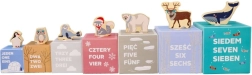 Hver kasse byder på mere end blot byggeri: du finder tallene 1–7, et tilsvarende antal dyr, billeder af polare venner og talnavne på tre sprog (PL/EN/DE). Takket være smarte udskæringer kan børn nemt skabe små huse, zoo og scener. Kasserne kan sættes ind i hinanden, så legetøjet er nemt at opbevare og tage med.