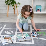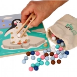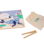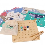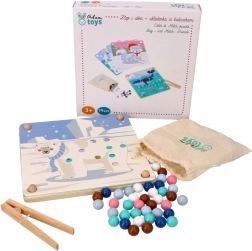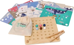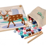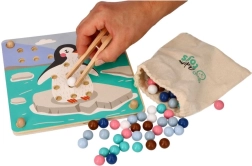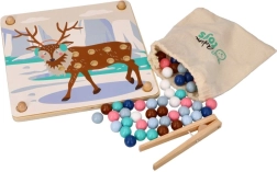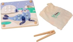 Denne sjove læringsleg forener børns naturlige nysgerrighed med færdighedstræning: Med en træpincet flytter børn kuglerne og lægger dem i hullerne efter farver og skabeloner med motiver af arktiske dyr (pingvin, sæl, rensdyr, isbjørn). Legen understøtter koncentration, præcist greb og sikker håndføring – ideel til førskolebørn.