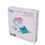 Massiv træplade, træpincet og stofpose med kugler sikrer sikker og langvarig brug derhjemme og i børnehaven.
