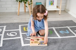 De kompakte mål 22 × 22 cm gør tavlen velegnet både hjemme og på farten. Massivt træ og metal-komponenter er slidstærke og egner sig til daglig leg. Legetøjet opfylder sikkerhedsstandarder og har CE-overensstemmelseserklæring.