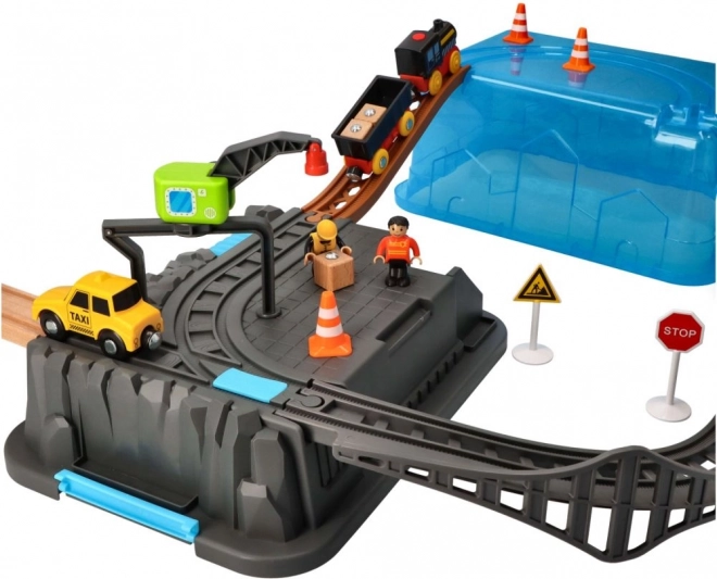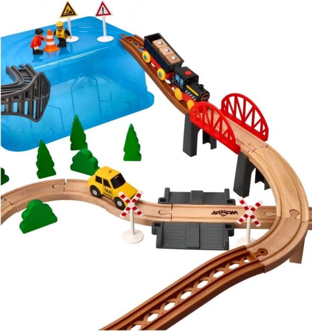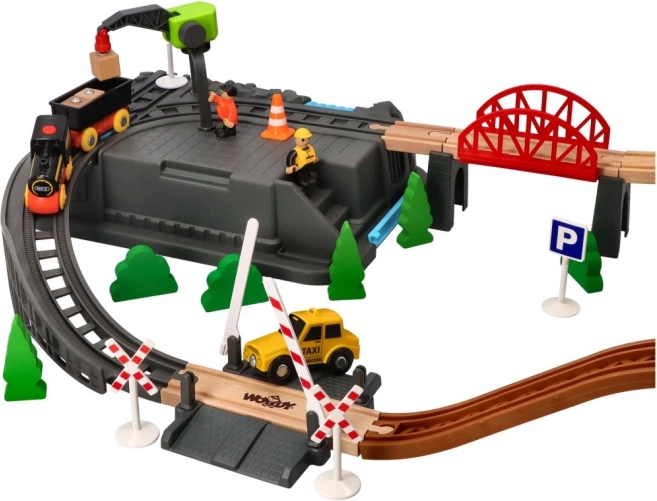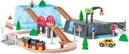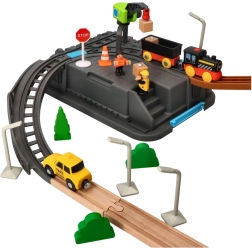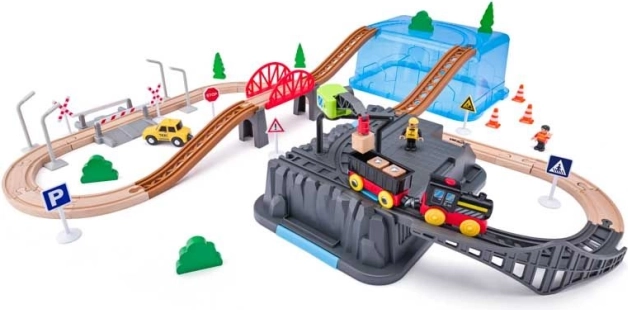 Dette børnesæt med togbaner og 63 dele tilbyder utallige muligheder for kreativ leg. Sættet er ideelt til udvikling af motoriske færdigheder og børns fantasi. Det indeholder farverige tog, broer, træer, trafikskilte og andet tilbehør, der bringer realistiske elementer ind i legen.