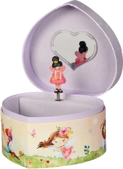 Dette charmerende smykkeskrin i spilledåse-stil kombinerer et magisk design med praktisk opbevaringsplads. Når låget åbnes, starter den kendte melodi Svanesøen, og den lille fe begynder at dreje rundt foran det hjerteformede spejl. Skrinet er en skøn gave til børn, der elsker smykker og eventyrlige motiver.