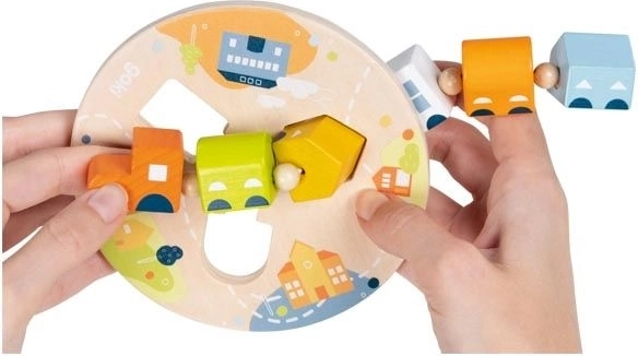 At indsætte og flytte de fem forskelligt formede vogne hjælper børn med at udvikle greb, hånd–øje-koordination og tålmodighed.