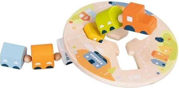 Dette kvalitets trælokomotiv fra GOKI er udformet som et snedigt færdighedsspil til at udvikle børns evner. Lokomotivet med fem forskelligt formede vogne kører gennem trevlingsbasen og fortsætter kun, når vognene er placeret på de rigtige steder. Sådan lærer børn naturligt logik og hånd–øje-koordination.
