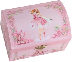 Dette smykkeskrin i klassisk spilledåsestil er en smuk detalje på børneværelset. Når låget åbnes, lyder den fortryllende melodi fra Svanesøen, og den lille ballerina danser foran sit spejl. Designet med ballettema styrker kærligheden til musik og æstetik.