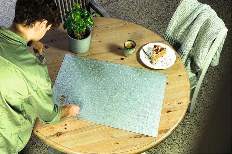 Den runde form og det monokrome sølvlook i KRYPT giver en ægte udfordring – du lægger efter former og forbindelser, ikke efter et billede.