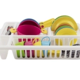 Et muntert børnekøkkensæt i et praktisk tørrestativ giver timevis af kreativ leg. Indeholder alt, hvad små kokke har brug for: tallerkener, kopper med underkopper, bestik, gryde med låg og pander. Kraftige farver fanger opmærksomheden og udvikler fantasi, finmotorik og orden – efter “madlavningen” sættes servicen nemt i tørrestativet ligesom hos mor.