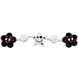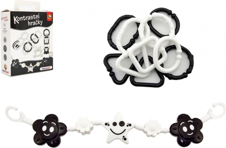 Sort-hvid ophængsbar barriere med blomster og stjerne fanger babyens opmærksomhed og underholder på gåture. Nem fastgørelse med kroge på barnevogn eller seng.
