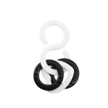 Sammenkoblelige silikoneøjer med relief masserer gummerne, stimulerer følesansen og giver et godt greb. S-kroge fastgør legetøjet til barnevogn eller autostol.