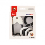 Sæt af sorte og hvide rasler, ideel til stimulering af syn og hørelse hos små børn. Perfekt størrelse til børns hænder.
