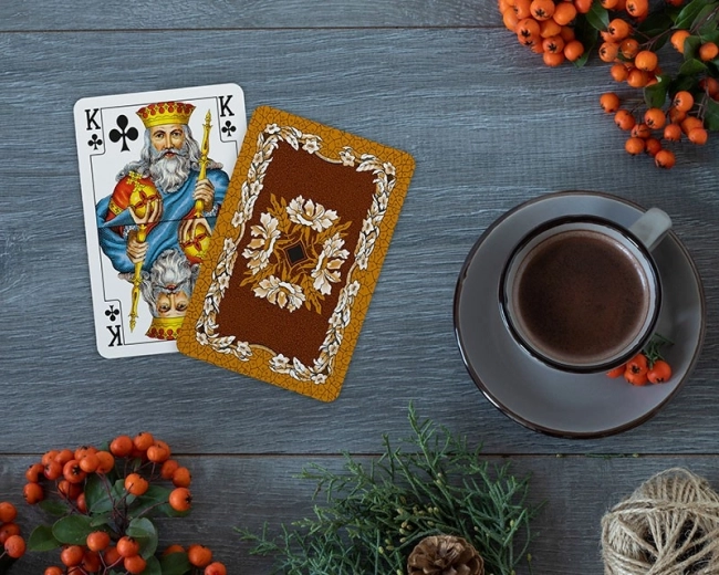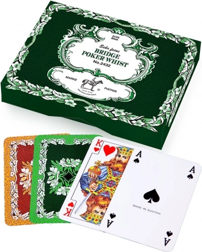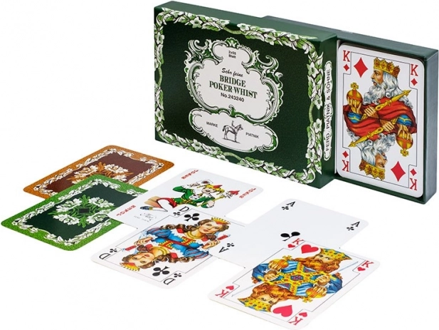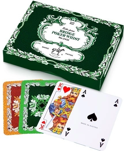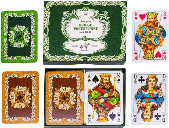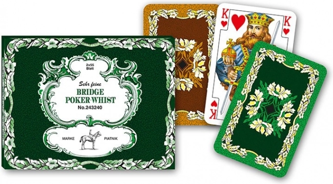 Klassiske spillekort fra Piatnik med motiv af egeblade i en praktisk dobbeltpakke vil glæde fans af bridge, poker og rummy. Hver pakke indeholder 55 plastificerede kort i størrelsen 58 × 89 mm med en vægt på 310 g/m², som udmærker sig ved holdbarhed, behageligt greb og elegant design baseret på en førkrigstradition.