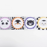 Den anden side gemmer på runde, plyssede flapper til den populære leg “peek‑a‑boo”, under hvilke børn opdager symboler for dyrenes mad. Flapperne indeholder knitrende materiale for blid auditiv stimulering. Mindre babyer lærer former og kontrast at kende, mens større børn forbinder dyrene med deres mad.