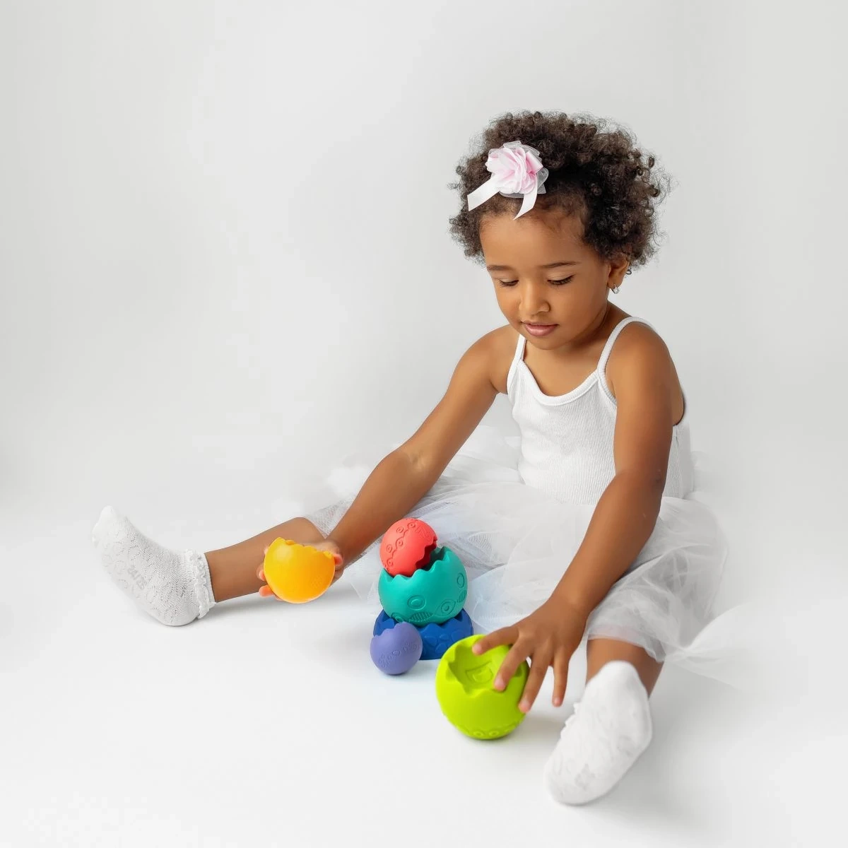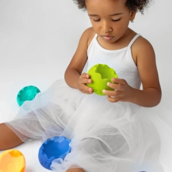 Opdag glæden ved at lære gennem leg med et sæt pastelfarvede dele, der udvikler sanser, motorik og koordination. Blødt, sikkert materiale, forskellige teksturer og muligheder for at stable og sortere understøtter naturlig udvikling fra de første måneder af livet.