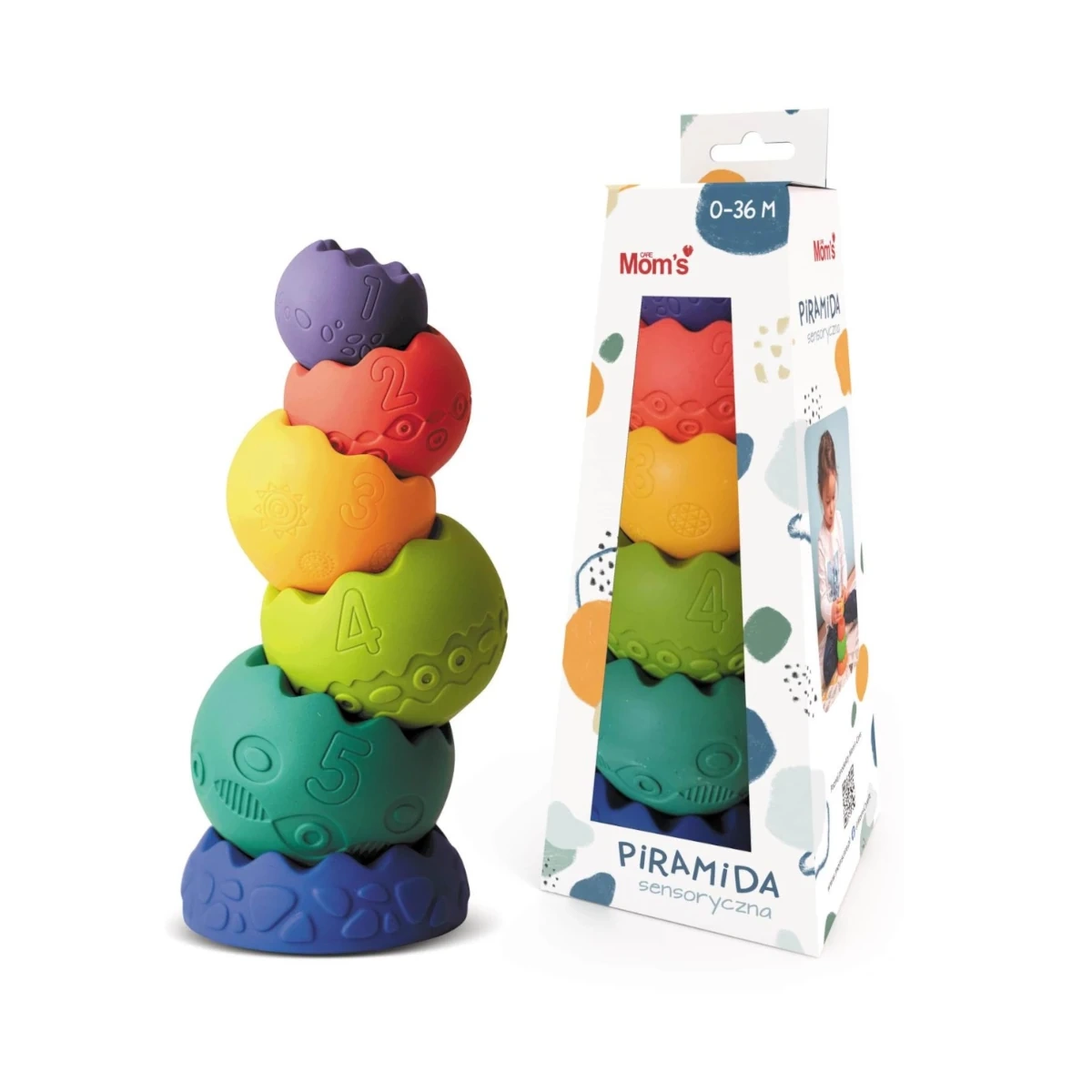 Denne sensoriske pyramide tilbyder alsidig stimulering af syn og berøring takket være varierede overfladestrukturer og blide farver. Børn kan stable delene til et tårn, sætte dem ind i hinanden, sortere efter størrelse eller farve og dermed træne finmotorik, hånd–øje-koordination og logisk tænkning.