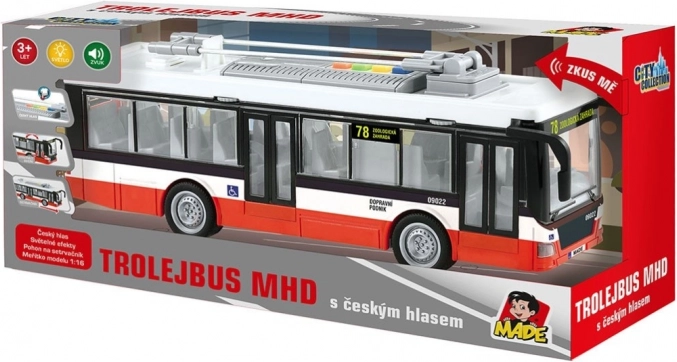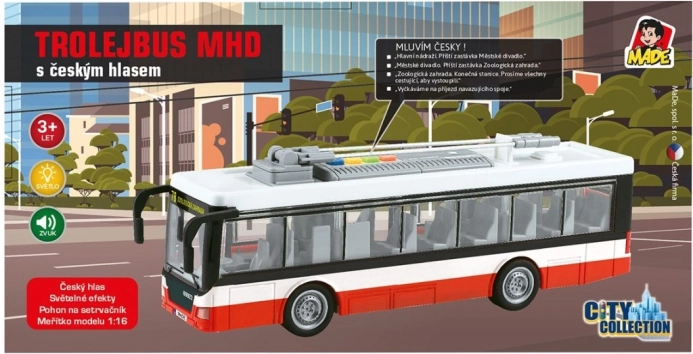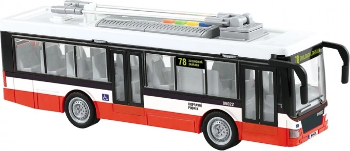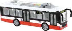 Denne detaljerede trolleybus giver børn en autentisk oplevelse af bytrafik. Legetøjet afspiller holdepladsannonceringer på tjekkisk (Hlavní nádraží, Městské divadlo, Zoologická zahrada) og er udstyret med attraktive lyseffekter. Takket være friktionsdrevet er det nok at skubbe trolleybussen, så kører den fremad.