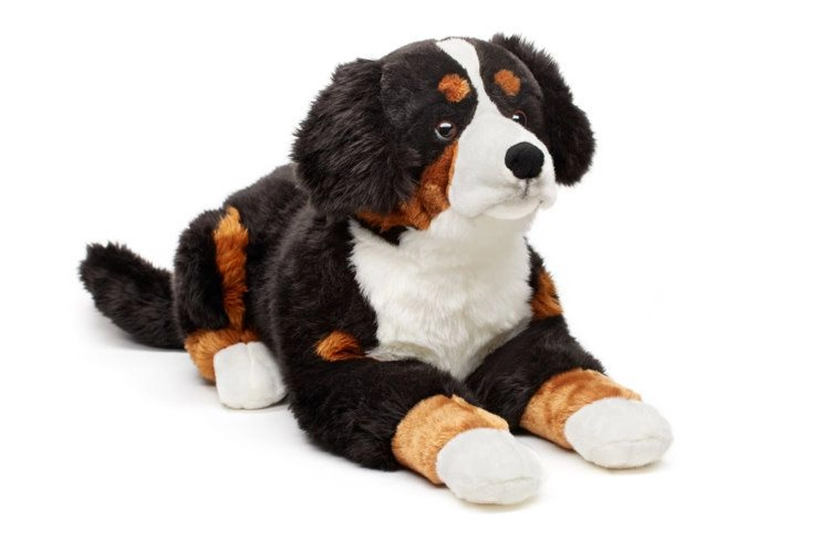 Denne bløde plysbamse inspireret af racen bernsk sennenhund imponerer med autentisk trikolor farvetegning og et sødt udtryk. Takket være den generøse længde på ca. 65 cm (uden hale) er den ideel til kram, som pynt på værelset eller som rejseledsager.